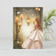 Schöne Sweet 16 Einladung mit Mädchen mit einem prächtigen Kleid stehend von hübsch leuchtenden Gartenlampen in einem Wald. 16 . Geburtstag Text ist in einem schönen Silber gemacht.
