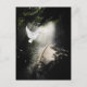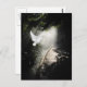 Schöne fliegende weiße Taube mit einer Holzbrücke und dunklem Laub Hintergrund mit einem Sonnenstrahl oder Sonnenlicht in seinem Weg Mehrzweck-Postkarte