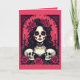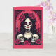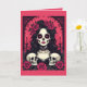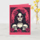 Ein auffallendes, stilisiertes Porträt einer Frau, das wie eine lebende Calavera dargestellt wird: Ihr Gesicht ist wie ein weißer Totenschädel geschminkt, die Augenhöhlen sind mit tiefem Rot umrandet, die Nasenhöhle und die Zähne sind sorgfältig in Schwarz nachgezeichnet. Ihr dunkles Haar fällt in langen, glänzenden Wellen um ihre Schultern. Die Farbpalette ist dramatisch begrenzt, was den Kontrast zwischen Leben und Tod, Schönheit und Verfall verstärkt. Auf verstörende Weise schön und zeremoniell: eine Verschmelzung von Eleganz und Makabrem, wo Trauer und Feier zusammentreffen. Kontrastieren Sie Leben und Tod, Schönheit und Verfall