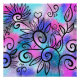 Ein lustiger kleiner Vogel in der oberen links Ecke und Blumenelemente auf einem rosa, lila und türkisfarbenen Hintergrund.