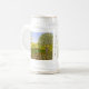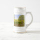 Ein Bierkrug mit einem schönen Bild einer Naturszene: Ein Vogel sitzt auf einem verwitterten Zaun, Wildblumen wachsen um den Zaun herum, ein Bauer auf einem Traktor bearbeitet sein Land, Bäume mit Blättern und Ackerland in verschiedenen Farben. Der Hintergrund, das Bild und der Text können personalisiert werden. Originalkunstwerk von W.B.