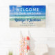 Dieses schöne Begrüßungsbanner am Strand bietet ein herrliches Foto der Meereswellen für eine Hochzeit in Urlaubsort. Hübsche Strandfotografie gepaart mit eleganter weißer und blauer Typografie schafft einen schicken, modernen Look für ein tropisches Inselereignis. Herzlich willkommen bei unserer Hochzeitssignatur.