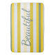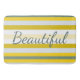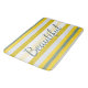 Designerbadematte in einem breiten, modernen, gelb-weiß und aquamarinen Streifen bedruckt. Der Text kann auf eine inspirierende Nachricht umgestellt werden oder Text ist abnehmbar. Die weißen Streifen können beliebig personalisiert sein.