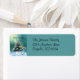 Ein schöner Weihnachtsbaum mit Schnee an seinen Ästen und Saiten goldener Lichter vor einem farbenfrohen Bokah Hintergrund.