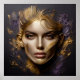 Ein Porträt einer schönen Frau, das mit einem realistischen Effekt zum Leben erweckt wurde. Das Bild ist aus schwarzem, strukturiertem Granit geprägt und mit abstrakten goldenen Linien, dunklen lila und goldenen Elementen geschmückt, umgeben ihr Gesicht in einer künstlerischen Umarmung und schafft so eine faszinierende und einzigartige Komposition.