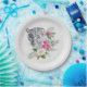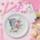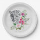Papier Teller mit einer schönen Abbildung mit einem grauen, schwarz-weißen Leopardenportrait. Dieses hübsche Tier ist von einer tropischen Blume umgeben. Elegant, exotisch und schön.