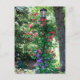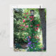 Lamppost dekoriert mit rote Rosen und lila Clematis in einer Parkgartenstraße an einem Sommertag.