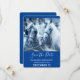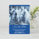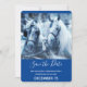 Save the Date Karte mit einem Foto eines Pferdepaares, das zusammengeklebt wurde. Ein schneebedeckter Tag und ein blauer Filter schaffen ein magisches Foto.