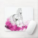 Mausunterlage mit einem extravaganten Pferdeentwurf. ein schöner grauer Stallion, der über rosa Wellen galopping ist. ein sehr nettes git für alle Pferdeliebhaber.