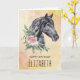 Glückliche Geburtstagskarte mit einer schönen Abbildung eines schwarzen Pferdekopfes mit einer extravaganten Blumenverzierung am Hals. Elegante und klassische Tiermalerei. Der Hintergrund ist ein extravagant abstraktes Design in hellgelber Farbe mit Imitaten Goldflecks.