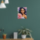 Dieses Blumenporträt zeigt eine wunderschöne, lächelnde schwarze Frau, die von Hydrangeas geschmückt und gehalten wird. Ein helles, farbenfrohes, fröhliches Bild mit rosa, blau, orange, periwinkle und rot.