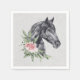 Papierservietten mit einer wunderschönen Abbildung eines schwarzen Pferdekopfes mit einer extravaganten Blumendekoration am Hals. Elegante und klassische Tiermalerei. Grauer Hintergrund.