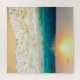 Die inspirierende Nähe des Sandstrandes und der himmlische Sonnenuntergang schaffen eine ruhige und entspannende Stimmung im Sommer. Eine Panoramafotografie mit tropischen Sonnenuntergängen im Meer, gefüllt mit schönen, hellen und orangefarbenen Farben des Sonnenuntergangs, blau und türkis des Meerwassers, mit einer fliegenden Möwe und Wasser Glitzern.