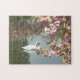 Dies ist eine Landschaftsversion dieses Fotos, mit einem nahen Aufgang des Schwans und der Kirschblüten. Es gibt eine andere Version mit mehr Teich.