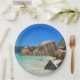 Teller aus Papier mit einem Foto eines türkisblauen Strandes mit großen Felsen, die entlang der Küste verstreut sind. Helle und sonnige tropische Lage.
