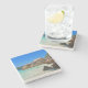 Ein Untersetzer aus Stein mit einem Foto eines türkisblauen Strandes mit großen Felsen, die entlang der Küste verstreut liegen. Helle und sonnige tropische Lage.
