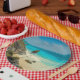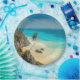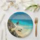 Papier Teller mit einem schönen Foto mit Tulum, Mexiko. Türkisfarbenes Wasser an einem Sandstrand. Der Wind hat Palmen gefegt, die in der Brise in der Nähe einer knackigen Klippe wehen. Entspannen und entspannen.