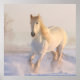 Ein Poster mit einem Foto eines wunderschönen weißen Pferdes. Laufen durch ein schneebedecktes Feld. Majestätisch und schön.