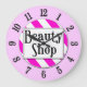 Eine einzigartige Wanduhr liest Beauty Shop in Retrobriefen auf einem rosa und weiß gestreiften Hintergrund umgeben von schwarzen Zahlen auf einem rosa Gesicht. Klicken Sie auf Anpassen, um Hintergrundfarben und mehr zu ändern, und rettete Sie Ihr Design für später.