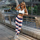 Abstrakter Streifendesign-Hintergrund und 70er Mode-Outfit passen zum trendigen, sich wiederholenden Streifen Design.
