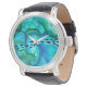 Dieses Uhrengesicht hat einen Aquarellhintergrund mit einem silhouetted Schulfisch, der über die Oberfläche schwimmt und auf die Oberfläche hochspringt. Ideal für Fisch- oder Meeresliebhaber.