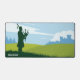 Eine grafische Schreibtischmatte, die eine Abbildung einer schottischen Landschaft zeigt, mit einem silhouetted Mann in einem Kilt, der Dudelsack spielt, stehend auf einem Hügel inmitten eines grünen Feldes. Im Hintergrund befinden sich eine Burg und Bäume und wenige Wolken am Himmel. Fügen Sie Ihrem Schreibtisch eine schottische Touch hinzu!