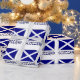 Der Schotte oder die Schottische Flagge ist blau mit einem weißen Salto. Es ist auch bekannt als St. Andreas's Cross. Unter der Flagge ist das Wort SCOTLAND in weiß und blau. Ihr Erbe wird auf diesem Geschenkpapier geteilt.