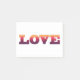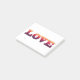 Liebe Wort in modernen bunten geometrischen Buchstaben auf Post es Notizen. Aufkleber post it note. Polygonaler lila, rosa, orangefarbener, gelber Schriftart