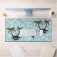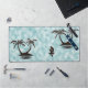Tropische Szene mit zwei Inseln, jede mit zwei Palmen. Segeln zwischen den Inseln ist ein kleines Segelboot. Bilder sind schwarze Silhouette vor einem wasserblauen, grün grünen Hintergrund.