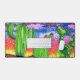 Brillante Farben des Sonnenuntergangs auf der Wüste mit Kakteen im Vordergrund. Kunstwerk von Deanna Pendrick.