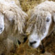 Zwei schöne Cotswold Schafe fotografierten in einem lustigen und humorvollen Moment, in dem sie miteinander sprachen. Cotswold Schafe stammen aus den Cotswolds in England und werden für ihre Wolle und Fleisch gezüchtet. Sie haben lange Fleecen mit fast goldener Note.
