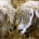 Zwei schöne Cotswold Schafe fotografierten in einem lustigen und humorvollen Moment, in dem sie miteinander sprachen. Cotswold Schafe stammen aus den Cotswolds in England und werden für ihre Wolle und Fleisch gezüchtet. Sie haben lange Fleecen mit fast goldener Note.