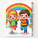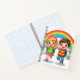 "Farbenfrohe Notizbücher mit einem niedlichen Cartoon, der unter einem hellen Regenbogen mit Lächeln, Schmetterlingen und flauschigen Wolken läuft - ideal für Kinder und Schulbesucher."