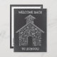 Willkommen zurück in der Schule! OR - Fügen Sie Ihre eigene Nachricht zu dieser niedlichen Kreide gezeichnet Schulhaus aus Schulfächern und Symbolen auf einer Tafel. Sie können die Schule auch verschieben und/oder vergrößern. Passen Sie Ihren eigenen Text an. Karo mein Geschäft für mehr pädagogische Produkte. Original Illustration von pj_design.
