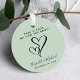 Ein lustiger, grüner Geschenktag für Gastgeschenke Hochzeiten aus Glas, Alkohol oder Espresso mit dem Titel "Take a Shot, We Tied the Knot" in einfacher Typografie (Sie können sich auf einen anderen Text personalisieren), zwei Herzen in der Mitte und Ihre Vornamen und Hochzeitstag.