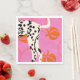 Ein gewagter und moderner Kunstdruck mit Hinterbeinen und Schwanz eines Dalmatiners vor einem lebhaften rosa Hintergrund. Stilvolle orangefarbene Pfirsiche und abgerundete Linien sorgen für eine spielerische, abstrakte Touch. Ideal für Hundefreunde und für diejenigen, die einzigartige Grafik-Designs schätzen.