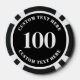 Diese maßgeschneiderten Pokerchips haben eine fettgedruckte Zahl und Text auf beiden Seiten, was ein sauberes und einheitliches Aussehen schafft. Jede Seite kann mit einer beliebigen Zahl bis zu vier Ziffern sowie mit individuellem Text personalisiert werden, um Ihrem Event oder Stil zu entsprechen.