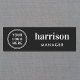 Berufliches schwarzes Namensschild mit dem Logo Ihres Unternehmens oder Ihrer Organisation, Ihr Name in fett minimalmodernen weißen Typografie und Titel in schlicht weißer Typografie.