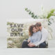 Geometrischer Retro-Deko schwarzer Text über eine Verlobung Foto Hochzeit speichern Sie das Datum. Die Rückseite bietet minimalistische Informationen mit einem Website QR Code auf der Rückseite (obwohl das gelöscht werden kann) mit einem klassischen weißen Hintergrund und schwarzem Text. Der Schriftart-Stil zeichnet sich durch ein Streifen-Motiv mit fett geometrischen Formen und Linien aus. Die Schriftart- und Hintergrundfarben sind vollständig anpassbar.