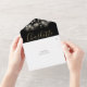 Alles in einer Hochzeitseinladung mit hübschen Saitenlichtern, elegantem goldenen Schriftnamen und Monogramm-Initialen auf schwarzem Hintergrund. Die Einladung enthält eine perforierte RSVP-Karte, die für Sie individuell adressiert oder links als leere Karte für die Handschrift der Adressdaten Ihres Gastes verwendet werden kann. Entwickelt von Thisisnotme©
