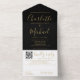 Alle in einer Hochzeitseinladung mit elegantem goldenen Signatur-Script-Namen und Monogramm-Initialen auf schwarzem Hintergrund. Die Einladung enthält eine perforierte RSVP-Karte mit Ihrem Hochzeitswebseiten QR Code und Details. Entwickelt von Thisisnotme©
