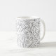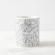 Einfach skizzierte schwarze Kreide-ähnliche Blume und Blätter bedecken eine weiße Tasse.