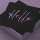 Eine elegante Visitenkarte mit dem Wort "Hallo" auf der Vorderseite im holografischen Glitzer mit Platz auf der Rückseite für Ihren Namen und Kontaktinformationen. Dieses Design enthält einen QR-Code auf der Rückseite.