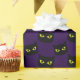 Schwarze und lila Katze Halloween Muster Wrapping Paper Party Supplies. Ein wunderschönes Halloween-Design mit schwarzen Katzenköpfen mit leuchtend gelben Augen auf lila Ober.