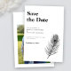 Minimal Design Wedding Save The Date Invitation verfügt über eine elegante Pfauenfeather Line Art Illustration in einem klassischen Schwarz-Weiß-Thema. Modernes und sauberes typografisches Design, diese Save the Date Einladung ist für Sie bereit, sich mit den Details Ihres besonderen Tages und fügen Sie Ihr eigenes Foto. Als Teil eines ständig wachsenden Sortiments an Schreibwaren, besuchen Sie bitte die Black Peacock Feather Wedding Suite für passende Artikel.