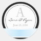 Runder Hochzeitsaufkleber mit dickem schwarzen Rand und blauem Band auf der Unterseite. Anpassbarer Text für ein Monogramm, Braut & Bräutigam Vornamen und Hochzeitstermin. Unter www.zazzle.com/daisylin712 finden Sie die passende Hochzeitseinladung und die RSVP-Karte.