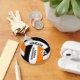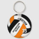 Der personalisierte Volleyball-Schlüsselanhänger mit Teamname zeigt das realistische Bild eines schwarzen, orangefarbenen und weißen Volleyballs, auf dem man den Spielernamen und die Trikotnummer sowie den Schulmannschaftsnamen und den Maskottennamen von katz_d_zynes anpassen kann