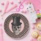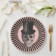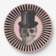 Diese Papierplatte weist einen schwarz-rosa Radialstreifen um den Rand mit einem rosa Zentrum und einem goldenen Rand auf. Ein Schädel mit einem Top Hut ist "tot" Mitte! Ideal für Halloween oder eine andere unheimliche Ansammlung.