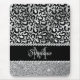 Oben glamouröses schwarz-silberfarbenes leopardenes Druckmuster. Imitate silberner Glitzer (aus Foto) auf der Unterseite. Es wird ein Schwarz-Weiß-Filter-Overlay auf die Imitate funkelnd Nashörner angewendet. Erstellen Sie Ihre eigene personalisierte Monogramm-Mousepad in Silber, Grau, Schwarz und Weiß. Wählen Sie Ihren bevorzugten zeitgenössischen Kalligraphie-Schriftart-Stil.