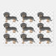 Desteis originelle Cartoon-Illustration eines niedlichen Drahthaarhaars Schwarz-Weiß-Farbe Dackel züchten Hund. Das Hundedesign wird neunmal auf jedem Blatt platziert. Der Hintergrund weist ein Muster grauer Hundepfoten auf.